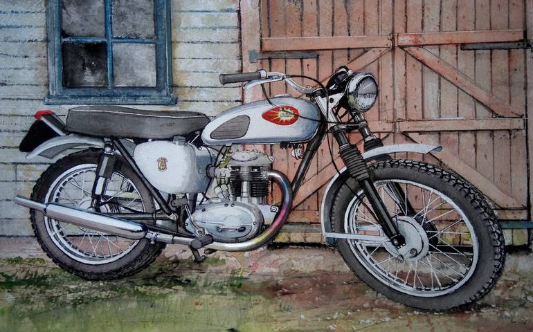 A watercolour painting of a popular BSA c15 motorcycle with a few non standard modifications, this successful four stroke single produced throughout the early sixtieswas subsequently eclipsed by the rise of Japanese motorcycles to Europe and USA