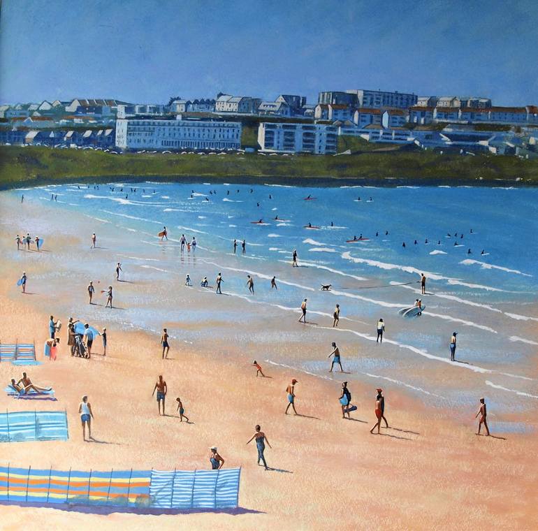 an afternoon at the beach is based on a visit to the location,Fistral beach ,Newquay,cornwall in the uk.The time is approximately midday ,I have tried to capture the atmosphere ,light and mood on a july afternoon at the beach known as the surfers paradise.The painting was completed using gouache on ...