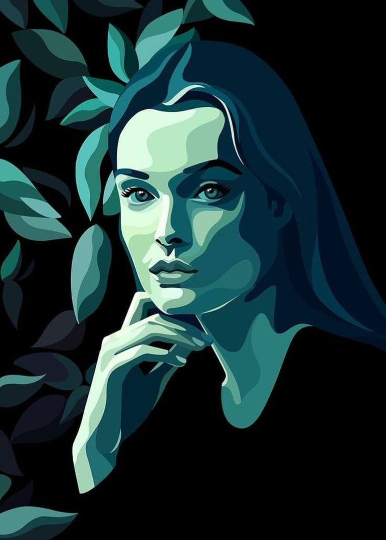 This painting is a stylized, acrylic portrait that blends realism with abstract elements, using a cool-toned color palette dominated by shades of teal, green, and dark blue. It depicts a woman gazing thoughtfully into the distance, her hand gently resting under her chin in a classic pose of contempl...
