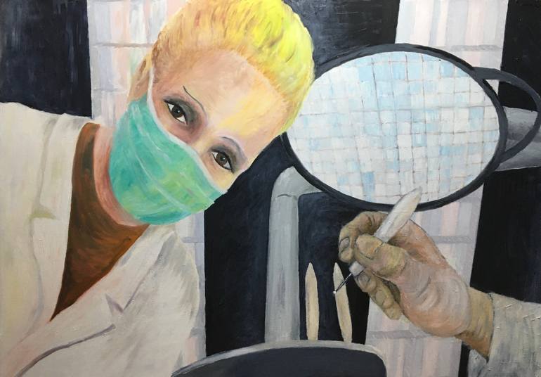 You don't like to go to the dentist? So I don't. Sitting in the chair waiting for the painful treatment you stare into the cold light wondering if there is anything to cheer your mind. And then she comes, the assistant... Well, I felt better then, and later I decided to paint it: lots of grey and a ...