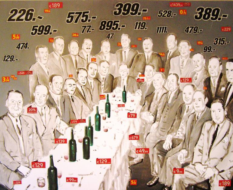 based on an old photo of a group of industrial men, it updates towards our times through a lowering price discussion...(what are they lowering the price of?)