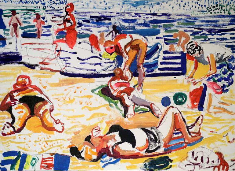 beach scene in the Algarve, Portugal, one my most memorable holidays and favourite beaches. *** this painting is shipped un-stretched, you will need to have it put on a wooden stretcher. ** I am drawn to depictions of leisure as beach or pool is a place where people are partly naked yet unaware an...