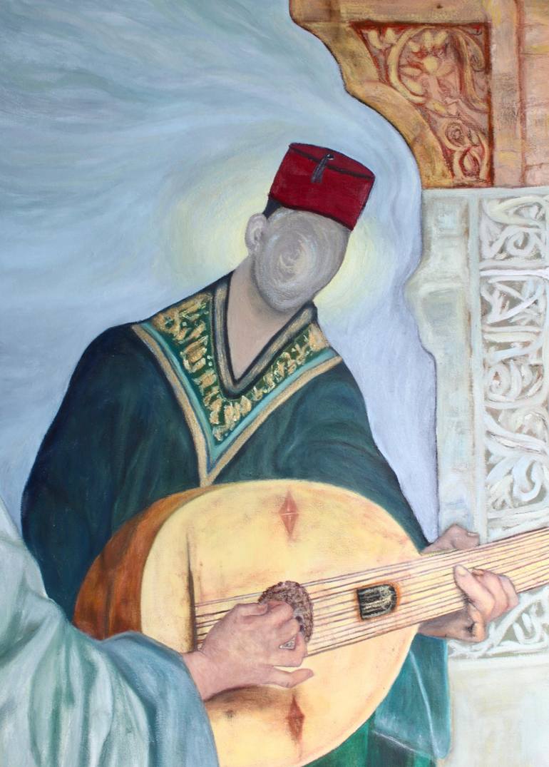 This painting captures the essence of Moroccan-Andalusian musical heritage through the figure of a faceless musician playing the lute. Dressed in traditional attire with intricate gold embroidery, the subject wears a Fez hat, symbolizing North African cultural identity. The background features ornat...
