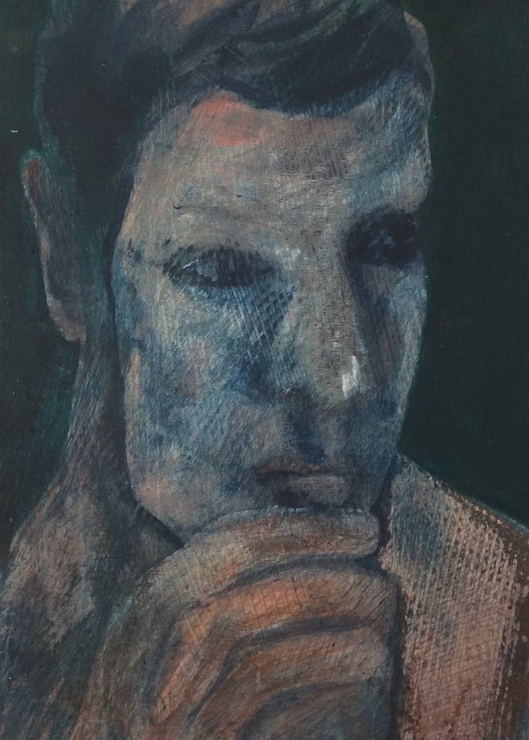 acrylic painting on navy blue cardboard box cover signed on backside, delivered with certificate of authenticity In his often abstracted portrait works, Jan pursues a concept of subtle beauty that reaches beyond established ideals. Primarily male faces, they fascinate through their magical presence...