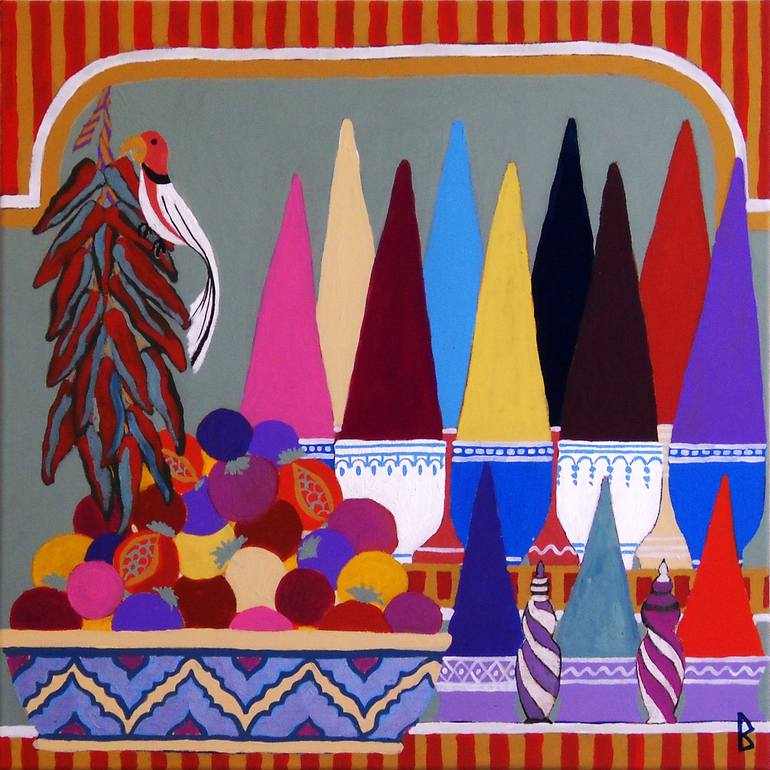 Colorful Spice Market - with Bird eating red Peppers I got this inspiration on a trip to southern India where the spice markets certainly are very colorful. The painting is ready to hang and needs no frame - great for a kitchen or dining room. The canvas is painted on the has my little symbol on t...