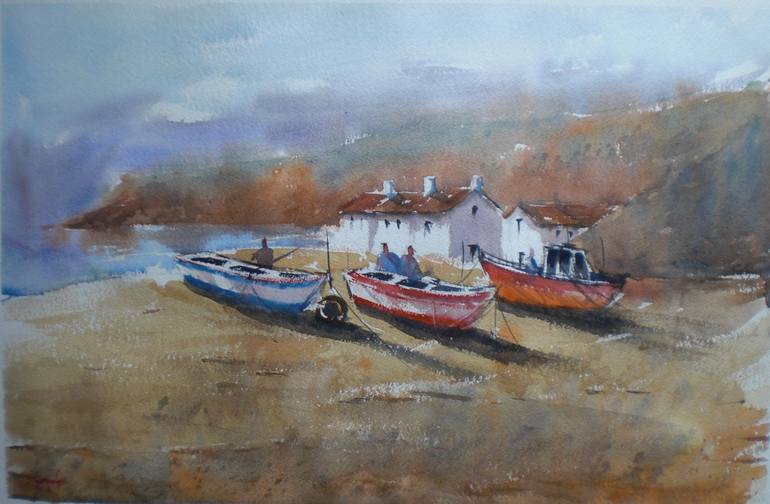 a few fishermen and boats on the beach This artwork is done on 300 g Fabriano Artistico watercolor paper with Winsor&Newton colors. Signed on the front, the Certificate of Authenticity is included.
