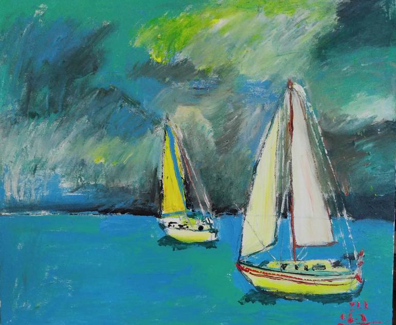 two sail boats set off to make a 2 days trip off the shore for fishing
