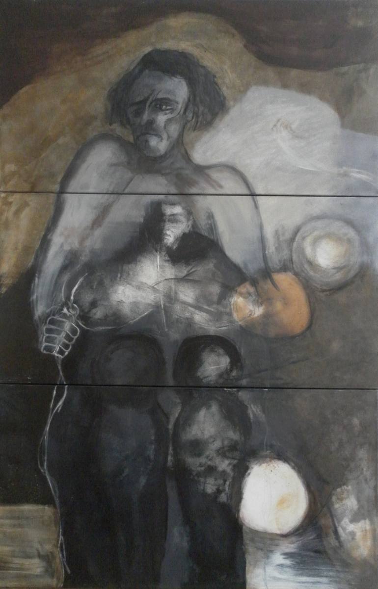 triptyque 3 chassis toile de 50 X 100 cm 3D chacun soit le triptyque d'un format de 150 X 100 cm Inspiration du poète, écrivain, dramaturge français ANTONIN ARTAUD Acrylique, pastel sec sur toile ready to hang noir, blanc, ocre jaune, personnage principal et autres...