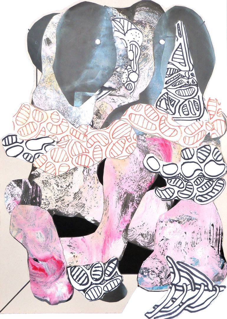 On n'est pas obligé d'être attiré par ces superpositions de rondeurs, il n'en est pas moins vrai qu'elles interpellent ! Ces monstres difformes d'un réalisme saisissant sont posés à l'huile ou à l'acrylique sur toile. Mais ce n'est pas tout, loin de là. L'artiste joue les superpositions, bien visibles quand on se place sur le côté de la toile et que les reflets de lumière accusent les épaisseurs. Utilisant la technique du collage qui se devait, à l'origine, de stimuler l'invention créatrice, Marlin emploie tout ce qui lui tombe sous la main - des bouts de tissus, des fragments de papier calque ou de papier-patron couture - qu'il découpe, compose, mélange, réhausse de couleurs, voire de morceaux de radiographies, fémur, colonne vertébrale, savamment placés à certains endroits pour créer des ombres. Le travail de Marlin, très répétitif, ne manque pas d'attirer la curiosité comme au cirque on s'amuse au spectacle du nain à bosses multiples faisant sur la piste ses pirouettes. On songe aussi aux poupées de celluloïd et de chiffon de notre enfance si souples qu'on pouvait en contorsionner sans risque bras et jambes et même zieuter, un peu sadiquement, les sombres points d'ancrage où se fixaient les membres. Tous ces personnages "impitoyables et graves" constituent un univers peu banal, parfois effrayant nuancé toutefois par une palette chromatique légère et raffinée adoucissant le propos. Pascal Marlin nous semble être un tendre gonflant ses fantasmes pour les mieux apprivoiser ! La lettre mensuelle Les chroniques de Colette Bertot / Février 2005 Pascal Marlin. Bizarre... Vous avez dit "bizarre"? A la Contrast Gallery de Bruxelles