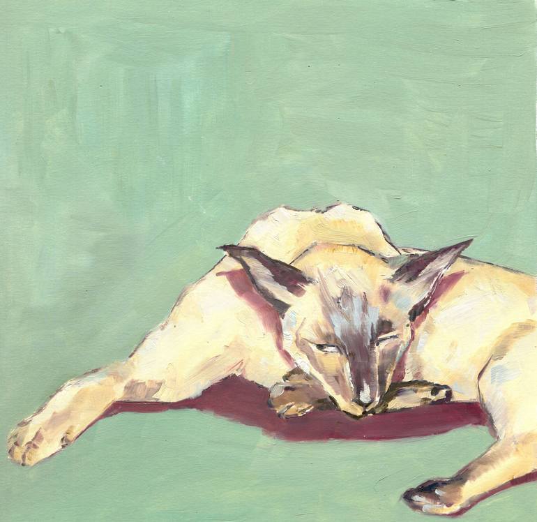 Immerse yourself in a world of tranquility and beauty with our amazing oil painting of a resting, lying down Siamese cat. This piece of art invites you to take a short break from your daily life to enjoy a moment of peace and tranquility. The cat's recumbent pose, its graceful features and soft gaz...