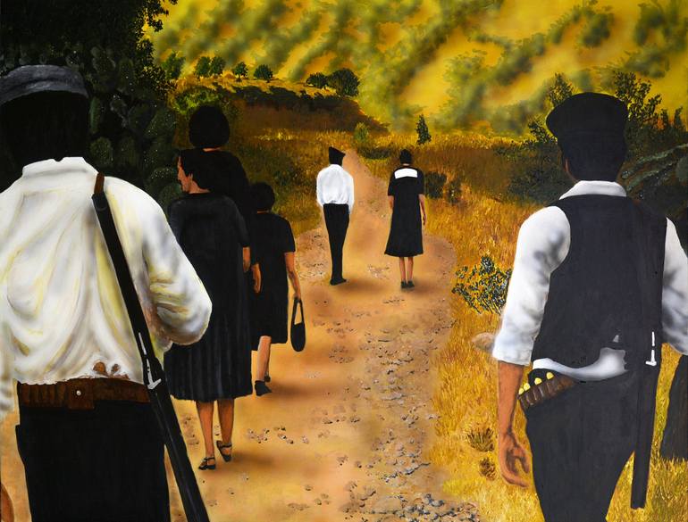 Upon seeing this tableau, some may see a romantic scene of a chaperoned date, while others will see a more austere and strict procession of a group of people who's freedom is limited by guns. The interpretation is for the beholder to decide. Wrapped in warm colors and soft contours, this figurative...