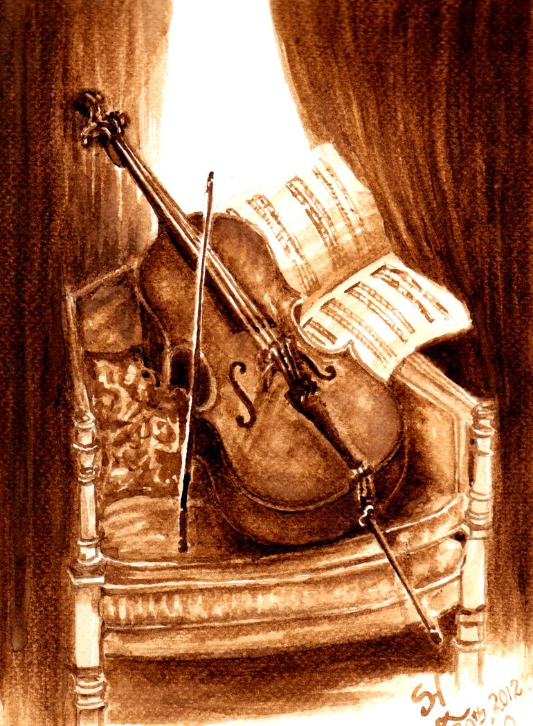 I love to do realistic subjects using my very own style. Inspired by my grand daughter's cello resting on the chair. I found coffee as a readily available material for painting and was pleasantly surprised by its versatility as a medium. When applied in layers on good quality watercolor paper, it al...