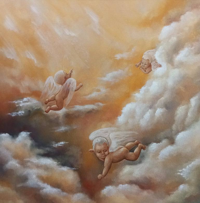 Oil painting on canvas, 60/60 cm. Angels fly in the clouds and watch the earthly life. My children are my main inspiration. For me, little children are the brightest thing that can surround us in our world. Their minds are pure and innocent while they are little. And this elevates them.