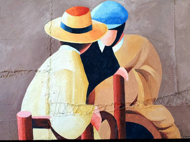 Inspirado en una fotografia vintage. Dos personajes hablan en una plaza . Materiales pobres :saco, cuerdas . Color , textura . Tensión...