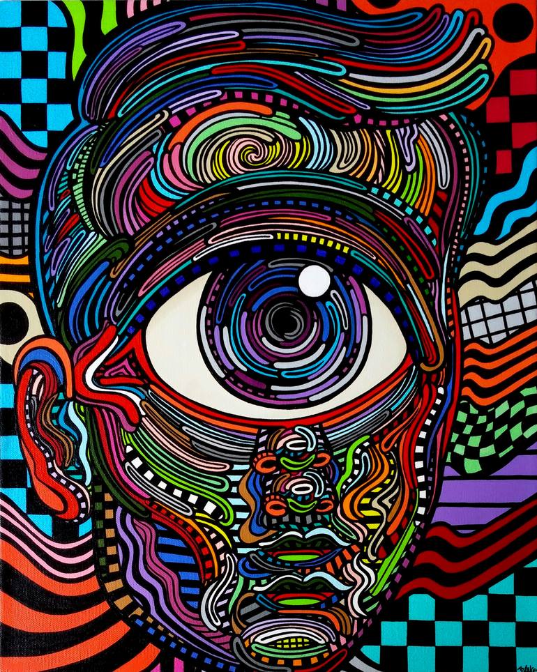 "cyclopulus" is meant to confront and challenge expectations of the human form. This unique portrait includes one huge focal point eye, two noses, and two mouths. It is comprised of colorful shapes and patterns in bright greens, oranges, pinks, reds, blues, aquas, yellows, and purples. It is tamed w...