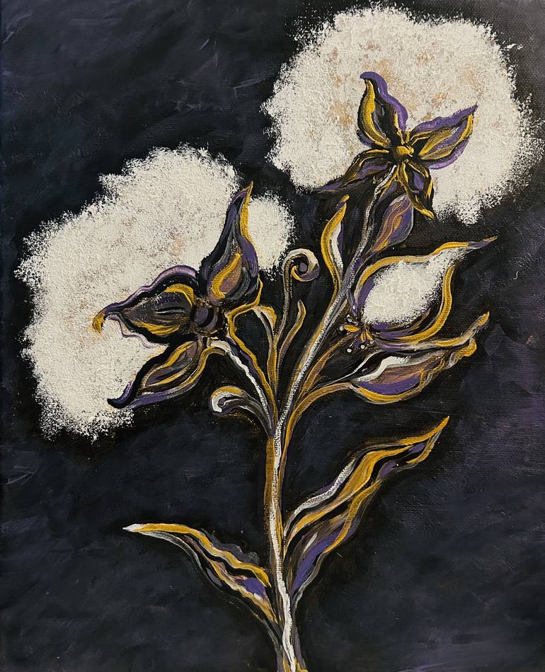 Wonderful cotton flowers on the forehead against a background with violet and gold elements. It will look perfect in any flower collection. I was inspired to paint these flowers by Wednesday Addams and her family. Don't let the dark background deceive you, just like Wednesday herself. You may see da...