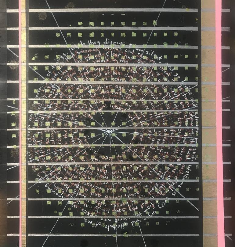 black and white, silver and gold, rectangular and radial; writing on the wall: legible, incomprehensible; the universe is orderly, understandable to the clairvoyant. painting signed, dated and numbered on the back; custom hardwood frame, ready to hang.