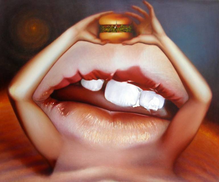 100x120 Free market,globalisme ; uniformity,fragmentation(loss of coherence,-traditions,-identity ; alienation) Relation culture(artefacts)-nature. Relation men-machine Materialisme(artefacts),massconsumption(waste,disposal-), Hamburger mcdonalds mouth teeth arms planet earth oilpainting surrealism...