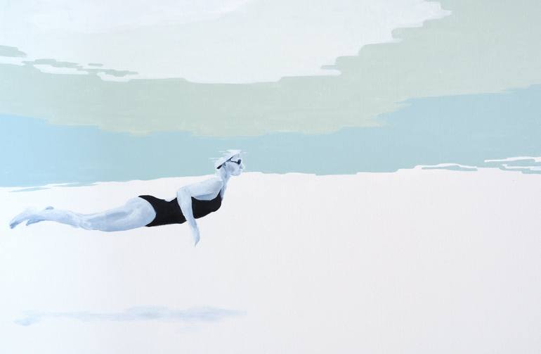 "I paint so as not to get depressed, I look for recreate the sensations I feel underwater, as a way to reconstruct that place, sometimes of security and serenity, and others of vulnerability and loneliness. I compose my images with few elements to provide visual rest: a few colours and one or two figures, which are often the same character and her reflection or alter ego. I use photography as a starting point, most of the time images that I take myself. Before painting I like to study the proportion of the figure, I draw a grid that helps me place it on the support exactly in the place I want and I draw it quite detailed. Then I paint with acrylic, due to its fast drying, the strokes do not lose spontaneity." Ana Patitú was born in 1982, in Argentina. She is currently living in Barcelona.