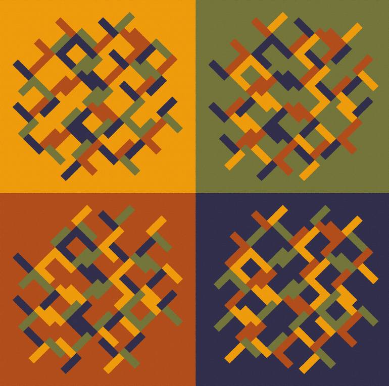 This conceptual-concrete art composition presents a coded message. In each painting, the title is made up of elements that symbolize a specific letter of the alphabet. Each symbol is defined by a unique shape that varies in its parts through different combinations of four predetermined colors. The r...