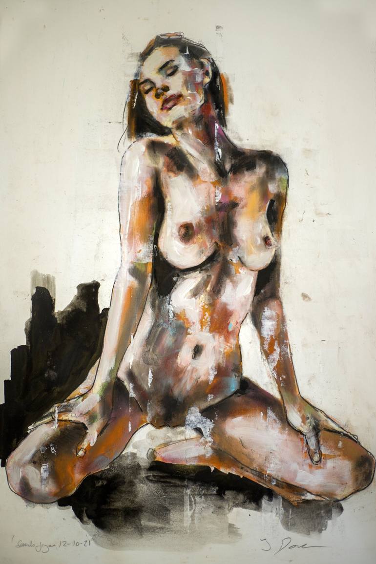 female figure 12-10-21 is a medium scale female figure in inks, watercolours, Acrylic and soft pastels on 200gms paper. The use of fluid mediums such as inks, watercolours and acrylics allows for a certain element of chance within the drawing and are produced quickly using expressive marks and stai...
