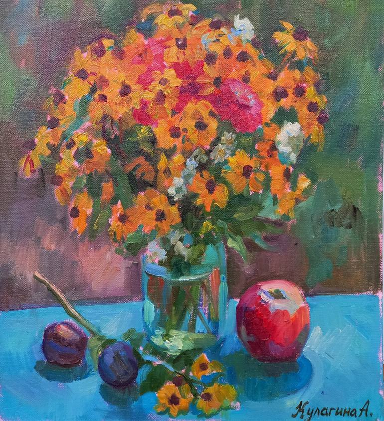 A fresh bouquet of wild flowers painted in the open air on a sunny summer day