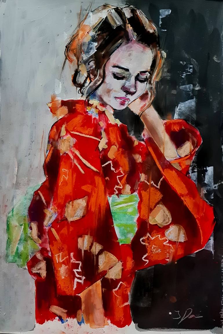 figure in red 7-30-23 is a medium-scale drawing depicting a woman wearing a kimono in inks, Acrylic and pastels The use of fluid mediums such as inks, watercolors, and acrylics allows for a certain element of chance within the drawing and are produced quickly using expressive marks and stains, givi...