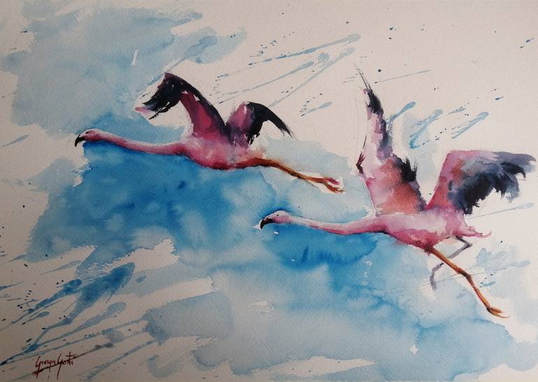 some colorful flamingos flying in the sky. This artwork is done on 300 g Fabriano Artistico watercolor paper with Winsor&Newton colors. Signed on the front, the Certificate of Authenticity is included. Please don't hesitate to get in touch with me if you have any questions about this artwork.