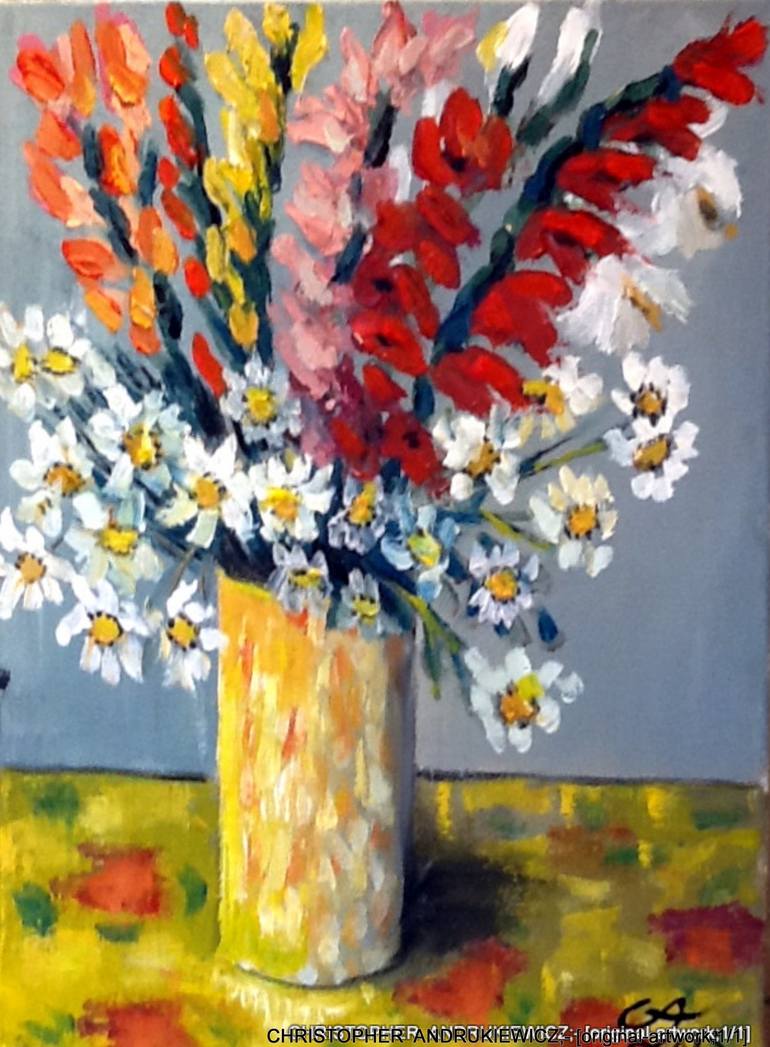 a modified painting to suit. a pattern bright vase ,sitting on a well pattern table cloth,a lively outlook. there are large glads flowers and daisy ones. a stable upright view. a very bright and lively pattern painting. oil on canvas .