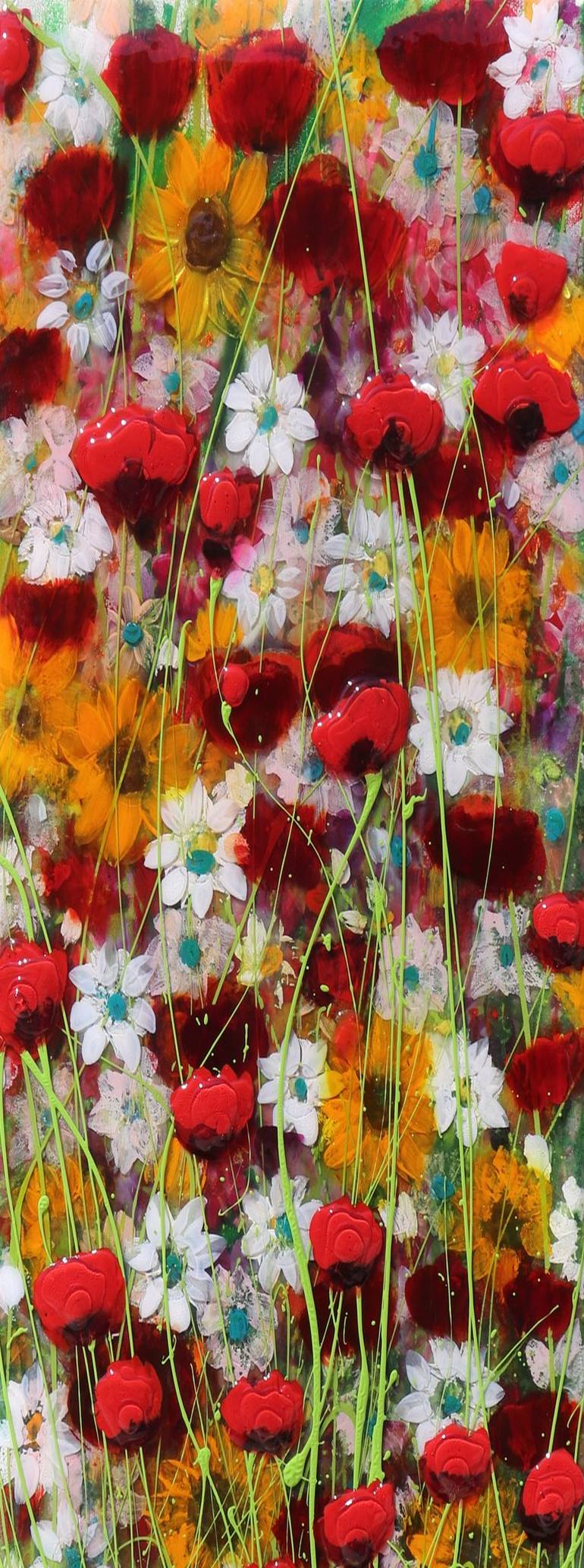 Nella mia opera ho voluto esprimere un'esplosione di vita e colore, attraverso l'uso di olio, smalto, resina e cemento. Ispirato dall'espressionismo e dalla figura, ho ricreato un campo fiorito, vibrante di energia e bellezza naturale. Ogni tocco della pennellata è un respiro della natura che invita...