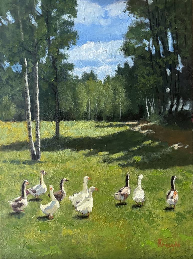 This painting capturing a serene landscape. oil paints brings to life a vibrant scene of geese enjoying a sunny day in a lush, green meadow. The artwork blends elements of realism and impressionism, creating a piece that is both true to life and full of artistic expression. Imagine this delightful ...