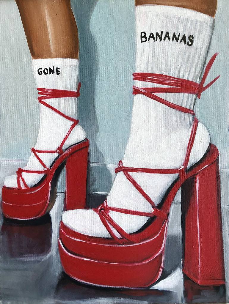 Maria Folger is a photorealist painter who lives in Los Angeles. She uses acrylic and oil paint to create portraits of women, playing on sexuality and femininity. Maria often depicts lingerie-clad beauties, vampy red lips, and patent heels but juxtaposes these subjects with pizza slices and pineapples, adding a humorous tone to some of her sensual works.