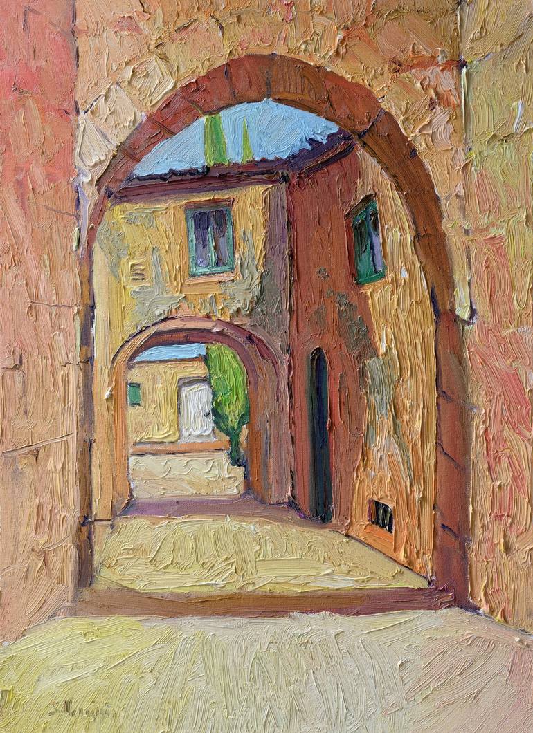 The thick texture of the paint reflects the beauty of the surface of old walls. Arches and old houses in Italian village make the artwork very dramatic. The artwork is painted on oil-primed canvas, stretched on wooden bars, and wired from the back.