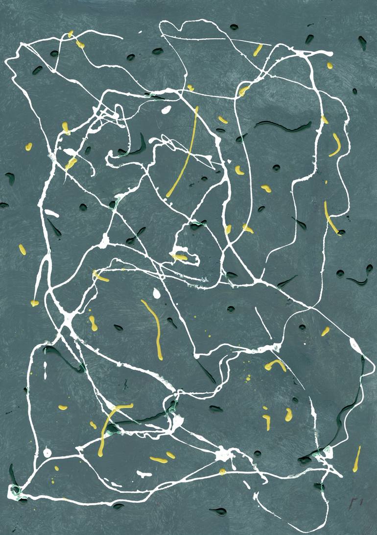 An abstract expressionist acrylic painting on paper. Clearly inspired by Jackson Pollock.