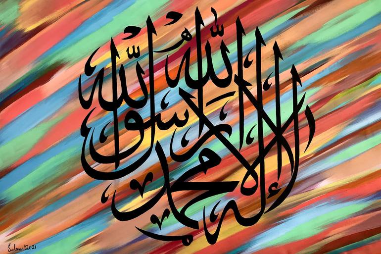 la ilaha illallah muhammadur rasulullah "There is none worthy of worship except Allah. Muhammad(sal-allahu-alayhi-waallyhi-wsalum) is Messenger of ALLAH." . Original modern Islamic Arabic Calligraphy Hand painted Medium: Acrylic on roll canvas