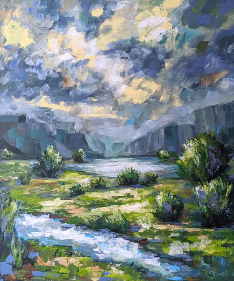 My painting is an immersion in a mountain valley painted with gray-green hues, under a cloudy sky. It is a philosophical view of life through the prism of symbols of eternity, love and infinite power, expressed with acrylic strokes on canvas.