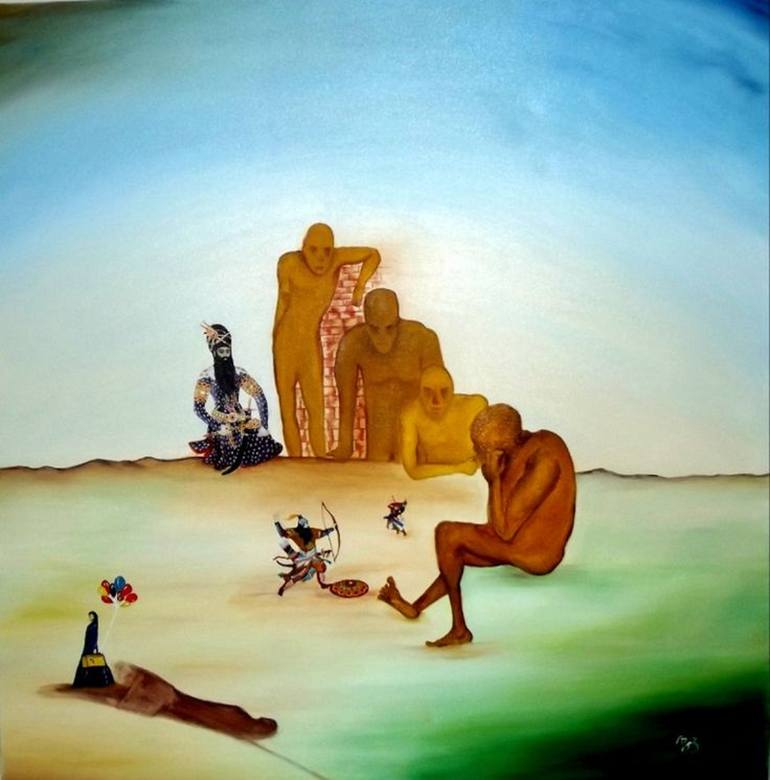 In this painting I tried to show the Cause of migration of people or Self-imposed exile . The four people that have a disappeared face are the most Major world powers of the nation and the king is a sign of a Puppet government which for them the peoples life doesn't matter and they don't evaluate p...