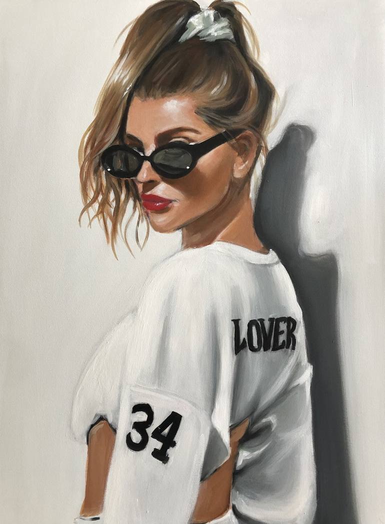 Maria Folger is a photorealist painter who lives in Los Angeles. She uses acrylic and oil paint to create portraits of women, playing on sexuality and femininity. Maria often depicts lingerie-clad beauties, vampy red lips, and patent heels but juxtaposes these subjects with pizza slices and pineapples, adding a humorous tone to some of her sensual works.