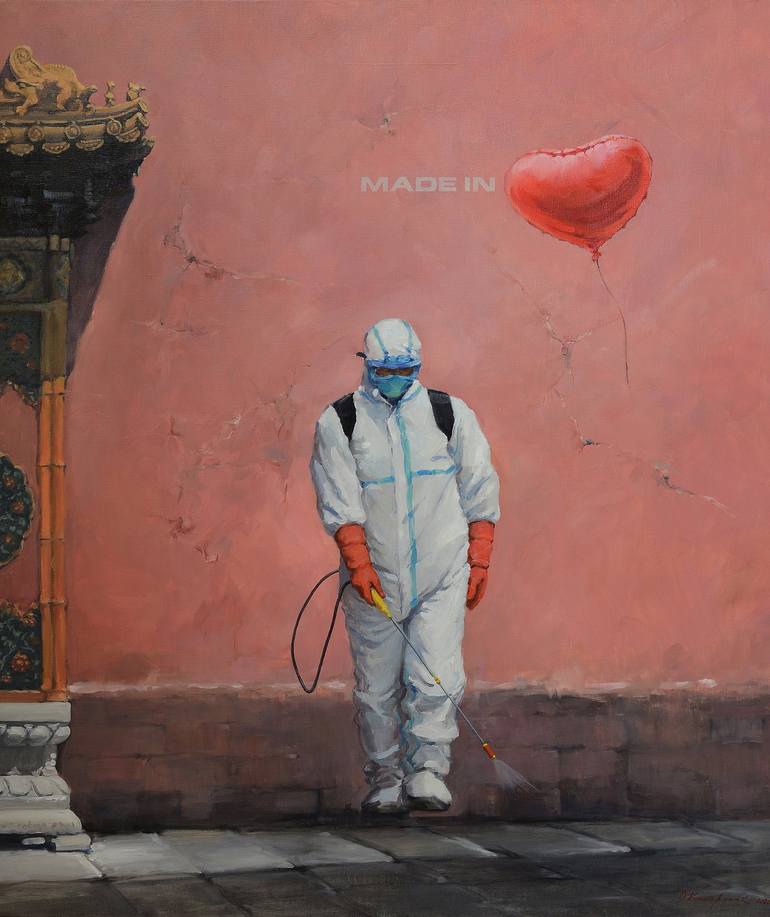 The work "made in love" depicts one of the participants in the process of disinfection at work. In a protective suit, mask, goggles. He clearly does his job. Is it his initiative, or did someone else instruct him to carry out this work? And it is no coincidence that he was depicted in an interesting...