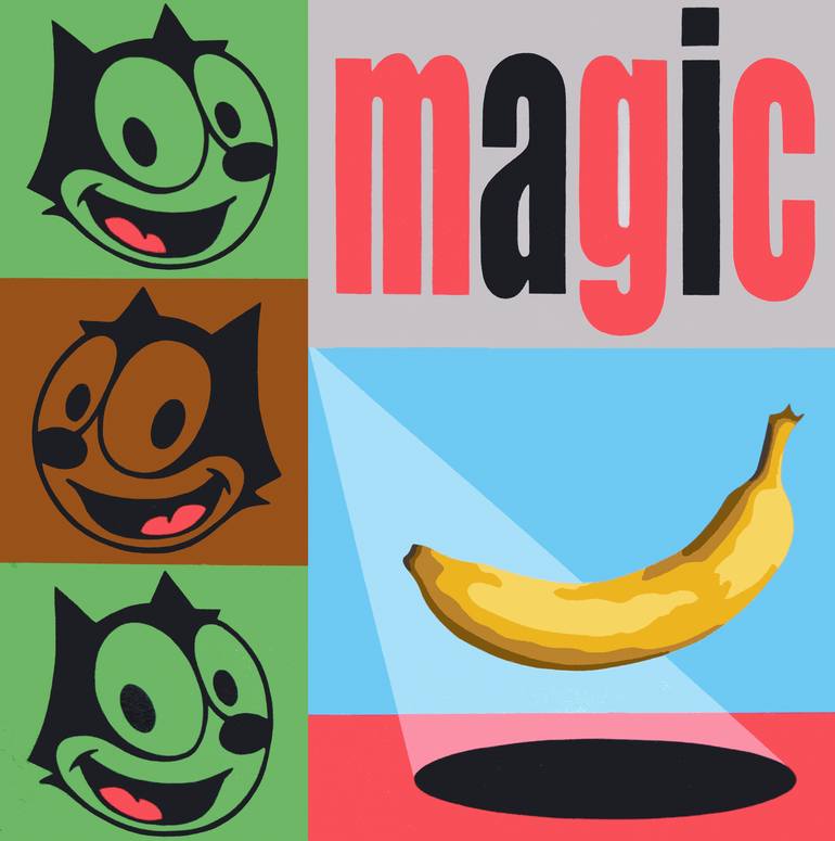 This original acrylic painting on canvas, titled "magic," is a playful exploration of pop and Freudian imagery. The artist brings together Felix the cat, a pop art icon, and the humble banana to create a carefully constructed composition. The meaning is left to the viewer, inviting personal interpre...