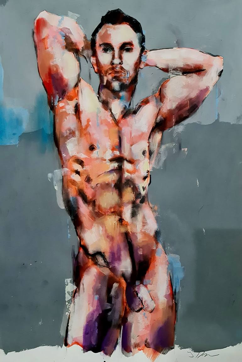 male figure 10-5-22 is a medium scale male figure in inks, watercolours, Acrylic and soft pastels on 200gms paper. The use of fluid mediums such as inks, watercolours and acrylics allows for a certain element of chance within the drawing and are produced quickly using expressive marks and stains, g...