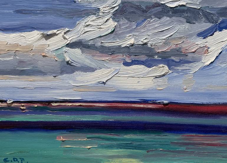 Part of the miami series, this piece just water and sky. the color ever changing in this dynamic interplay. This was a joy to paint, i would hope the viewer finds this also in the gaze. The oil paint allowing me to to almost sculpt the clouds in this small work, finding the movement and atmosphere w...