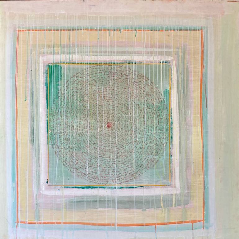 One of a series of text-based paintings: a spiral of text, in the tradition of the Ancient Greeks. Legible, but who has the patience in the contemporary world to invest the energy to read in a spiral? Proof that communication takes effort, commitment, investment. Color wash with pale greens, yello...