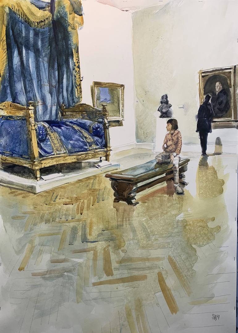 scene from San Francisco museum of Legions with little girl observing antique daybed