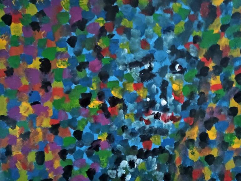 This work has been part of my portfolio over the years, a technique developed by me with large and colorful color dots, not to artificially represent reality, but to confuse the observer and lead him to discover what is between the colored dots, be it a geometric, animal or human figure.