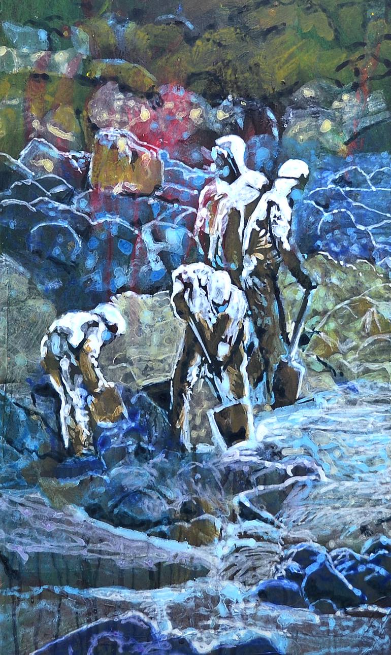 This painting is based on a foto of some men cleaning up the remains of an oil spill.