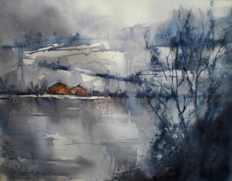 some houses immersed in the snow on the shores of a lake; a winter atmosphere for this watercolor. This artwork is done on 300 g Fabriano Artistico watercolor paper with Winsor&Newton colors. Signed on the front, the Certificate of Authenticity is included. Please don't hesitate to get in touch wit...