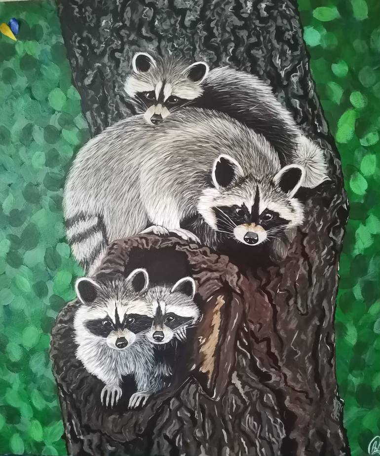 Picture is made on primed wood fiber board. This is how I finished this painting. It has a cute family of raccoons. Which live peacefully in their own home, but if necessary, even these harmless creatures are ready to bare their fangs and claws to defend themselves. This was perhaps the most diffic...