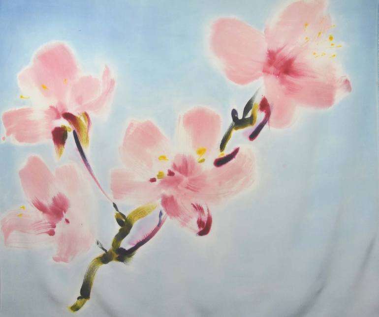 Pink cherry blooming I is textile artwork. The painting is made on lightweight crepe de chinese with special silk dyes and steamed. Fresh, spring sketch of blooming pink cherry flower on lihgt blue background evokes happiness, and spring mood. It is minimalistic and bright artwork that brings optimi...
