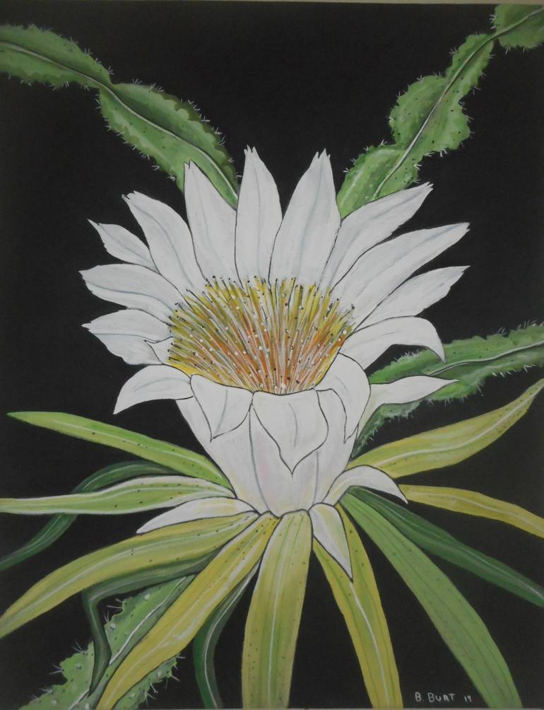 queen of the night cacti , blooms at night only. this beautiful Cacti is inspirational from my garden. see all my work of nature and pop Art Bruce Burt. Painting can be rolled